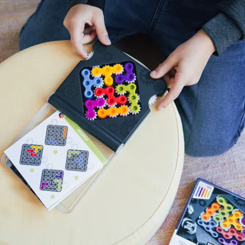 The IQ series of games is so popular. This is IQ Gears – a game with 120 levels of challenge. The rules are simple – all the pieces must fit into the grid. Each level gives you the location of some of the pieces, with blank areas left for you to fill up. However, the pieces can be rotated to fit in many different ways or reversed to fit the other way up. When everything is in the right place, the gears on the edge of the board will turn freely, showing that they are engaging correctly. No movement means that something is wrong and you will need to think again!